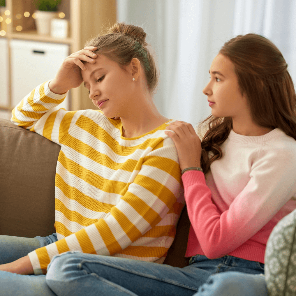 Anka siada na kanapie, a przyjaciółka pochyla się lekko w jej stronę. Podpiera brodę ręką.